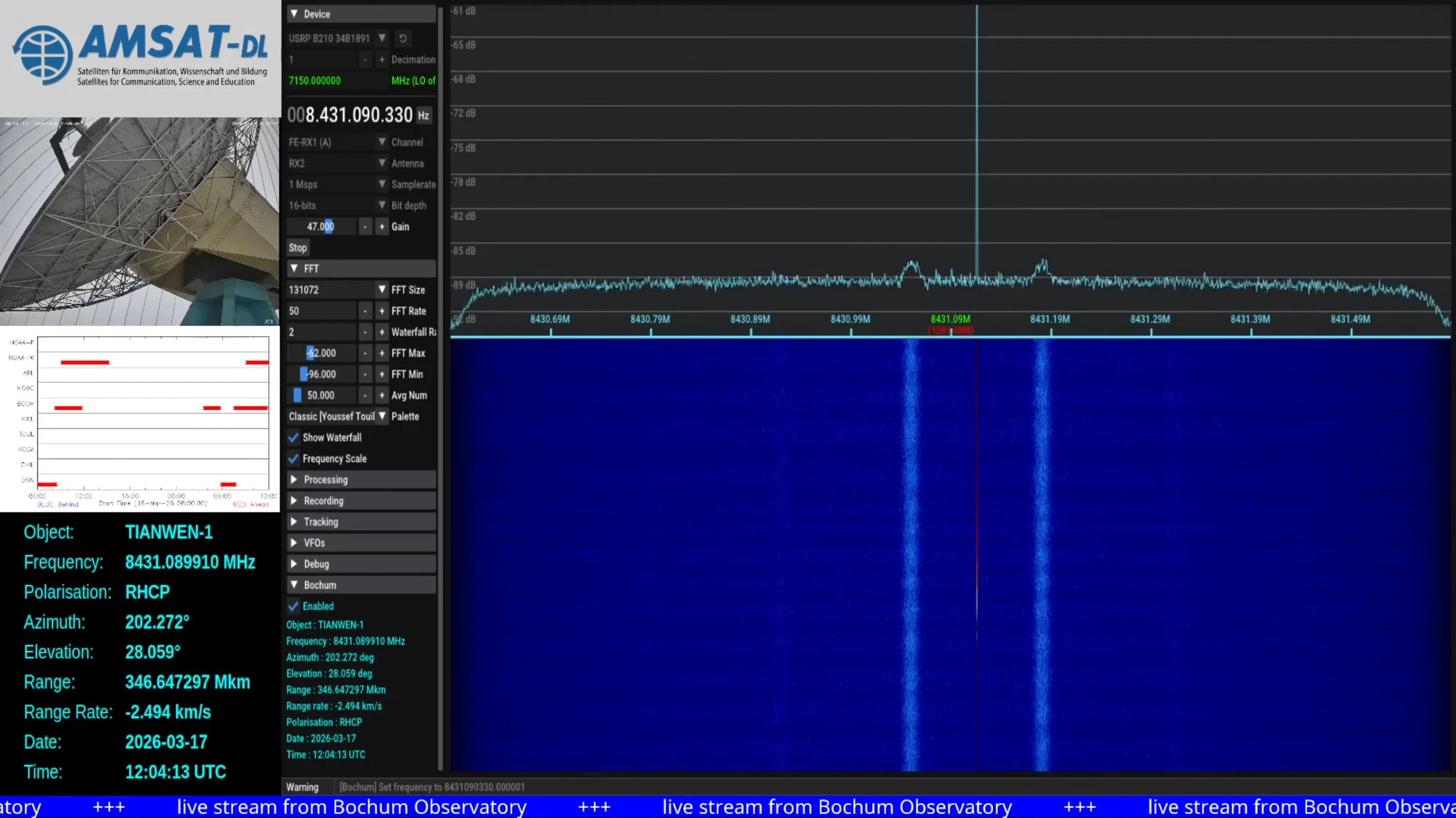 A few days ago I posted about the fact that AMSAT-DL had not received any signals from Tianwen-1 since 2025-12-23. For months, AMSAT-DL had kept listening to the orbiter’s frequency with the 20 m antenna in Bochum and had not detected any signals. Yesterday, AMSAT-DL announced that they had received again the signal from Tianwen-1.