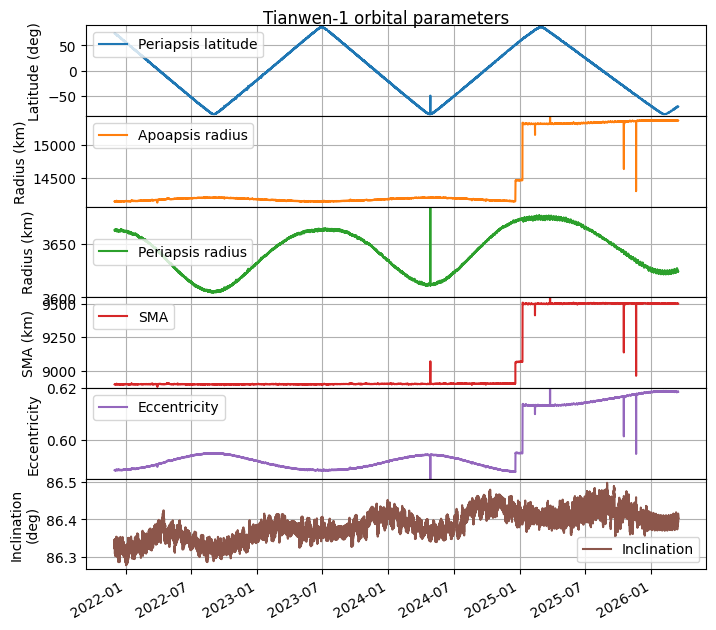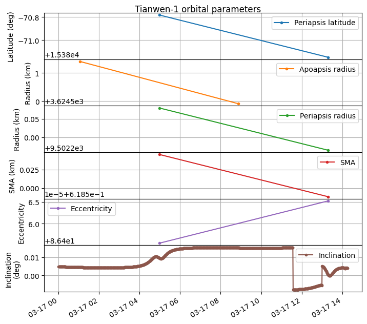 Screenshot of Tianwen-1 reception in Bochum shared by AMSAT-DL Telemetry containing state vectors was decoded between 2026-03-17 11:34 and 14:16 UTC. I have updated my plot of orbital parameters to include this new information. The period between 2025-12-23 and 2026-03-17 corresponds to a propagation with GMAT of the last telemetry received in 2025. The end of the plot corresponds to the telemetry received in 2026-03-17.