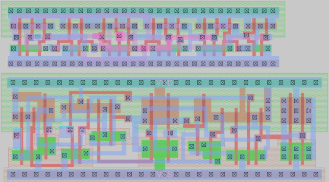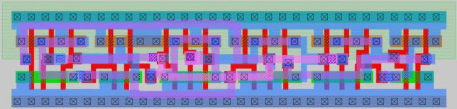 Note that the standard library cell has output transistors that are three contacts tall on the PMOS and two contacts tall on the NMOS in order to properly drive higher fanout loads. My output transistors are just one contact tall and would need a buffer to drive the load unless the fanout is small. It is also clear how the difference in the height of the cells makes routing much easier in the standard cell. In particular, the standard cell uses the polysilicon layer to connect together the gates of multiple transistor pairs, avoiding the need to run metal contacts for these. I simply cannot do this trick with the height I have chosen for my cell.