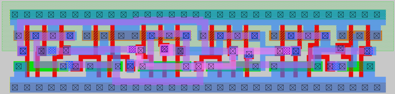 The following shows a comparison of my fdc_dense flip-flop (top) and the IHP-Open-PDK standard library sg13g2_dfrbpq_1 (bottom), imported from the GDS II into magic.