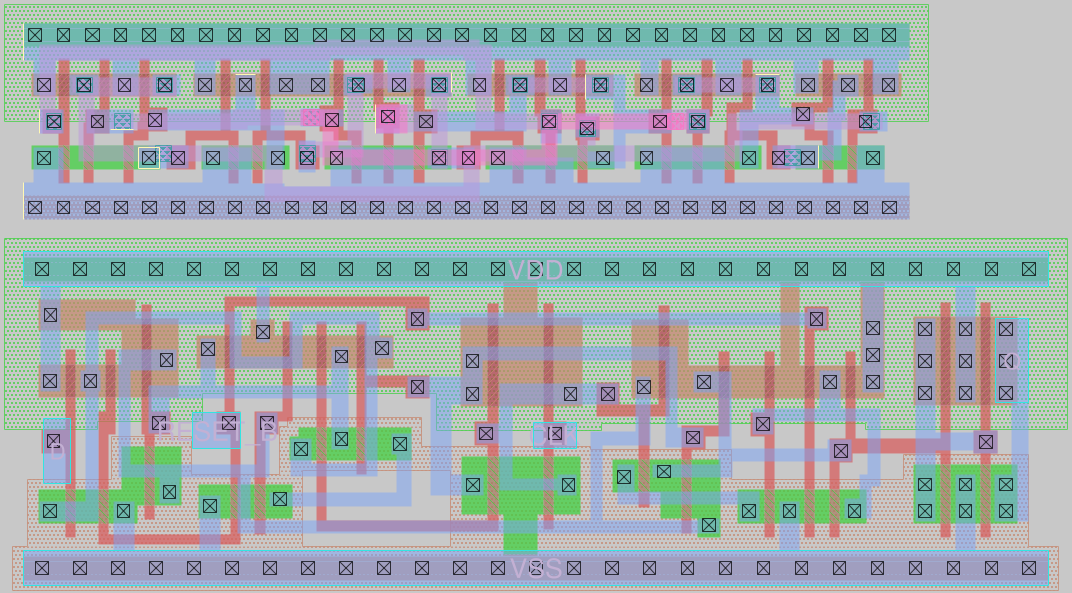 There is almost a difference in area of a factor of two. My cell is 31.8 μm², while the standard library cell is 59.8 μm². Therefore, I think that trying to make such a small cell was worth the effort and could be interesting to use in some cases.