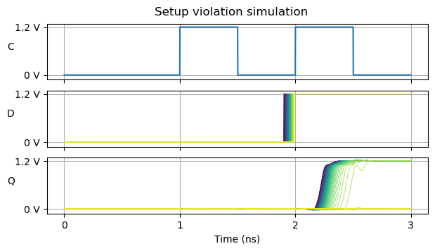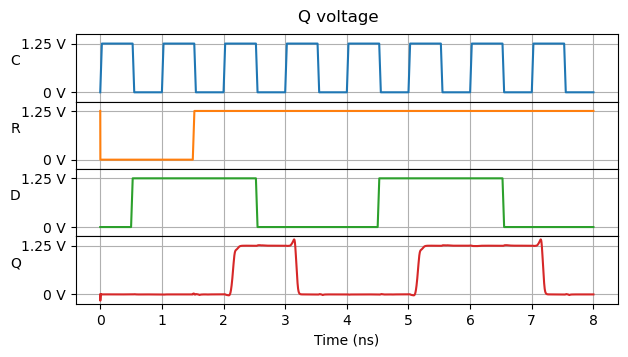 Before measuring the timing properties of the flip-flop it is necessary to do some basic simulations to check that the circuit is indeed working as a flip-flop, and that there are no wiring mistakes. For this, I wrote a simple spice script that generates simple waveforms for the clock, reset and data. The voltage at the output of all the NAND gates, including the Q output of the flip-flop, is output to a text file. This can then be plotted in a Jupyter notebook, and the plots can be checked visually to verify that the cell is working as intended. The following plot shows the three inputs and the Q output. The notebook contains the plots for all the other gates.