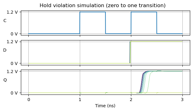 The following simulation gives us a good idea of how hold violations work. Here the situation is that the input data of the flip-flop is zero, but it is going to transition near the clock edge. We expect the output of the flip-flop to be zero in the next clock cycle. If the output goes to one, then it is because hold was violated. The transition times range between -25 and -15 ps, spaced in 1 ps intervals.
