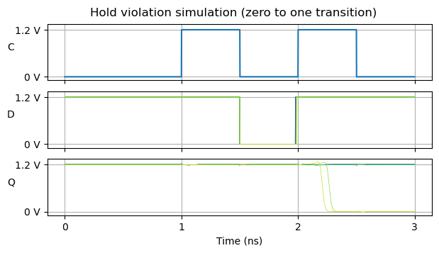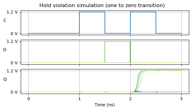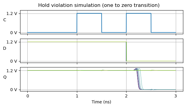 There is another pattern for the data input that is relevant for the hold simulation. This is illustrated by the following plot. It considers the case in which the flip-flop output has the value one, and the input is zero, but transitions to one near the clock edge. In this case we expect that the flip-flop output transitions to zero some time after the clock rising edge. If this doesn’t happen, then it is because hold was violated. Comparing this to the simulation above for which the input transitions from zero to one (so the Q output must remain all the time at zero if hold is met), we see that the range of transition times for which hold is met is similar, but not exactly the same.