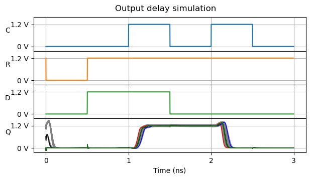 These runs give a good idea of what the behaviour of each of the corners are. The output delay simulation results are shown in the plot below. The Q output is coloured depending on the corner used for the corresponding run. mos_ff
