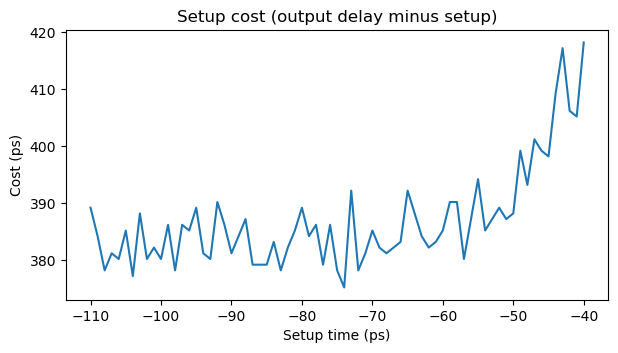 What we see is that as the setup time gets closer to zero, the cost increases non linearly. However, for a certain range of setup times the cost metric is rather flat and small. If we extended the plot to the left, to more negative setup times, we would see the metric increasing again. Since we want to minimize the setup cost metric but also make the setup time as small (close to zero) as possible (the reason for this will be more clear when we think about hold timing), from looking at the plot we see that it is reasonable to define the setup time as -70 ps. A conservative cost for this setup time would be 395 ps. This implies that the output delay should be defined as 325 ps.