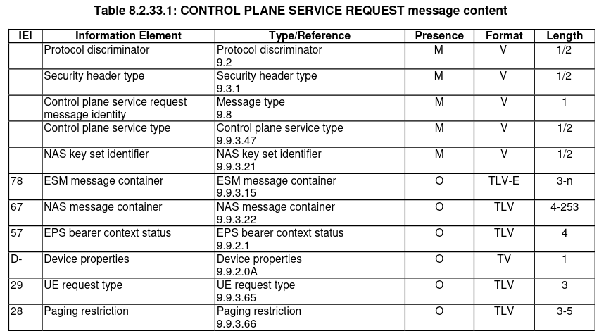 The format of the control plane service request message is given in Section 8.2.33 in TS 24.301. Except for some missing optional fields, this matches what we see in Wireshark.