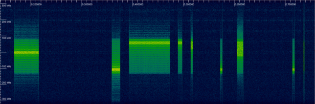 The waterfall of the V16 beacon transmission that I recorded is shown here. The whole transmission is comprised of multiple bursts, and it takes slightly less than one second.