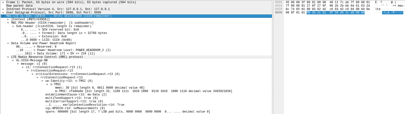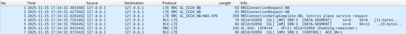 It makes sense that the UE got this rather large uplink grant, since in the Data Volume and Headroom Report it said that it had probably enough data to fill it, and in fact it does. Looking at the decoded MAC PDU in Wireshark, we see that it is an UL-DCCH message in SRB 3 that contains an rrcConnectionSetupComplete-r13 message. We do not see the messages sent on the downlink by the eNB, but from what we see on the uplink and the knowledge of how a regular LTE connection works (see my post about the LTE MAC layer), we infer that this message is a response to an RRC connection setup message sent by the eNB.