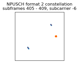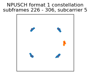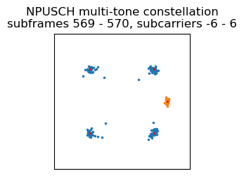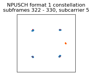 At this point we can perform OFDM demodulation of the first NPUSCH transmission and apply the phase rotation to verify that we obtain a clean QPSK constellation. The constellation for this transmission is shown here. The symbols in orange correspond to the DMRS, which is a pseudorandom BPSK sequence that has already been wiped off in this plot. The details of the DMRS are given below. The DMRS has been used to perform equalization. For each transmission, a constant phase and amplitude is determined using the DMRS and used for equalization of the data and DMRS symbols.