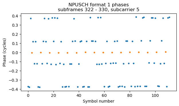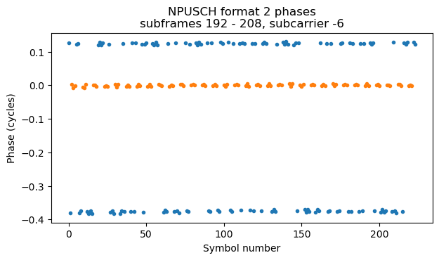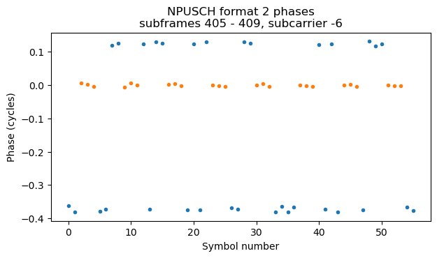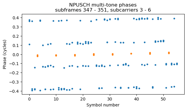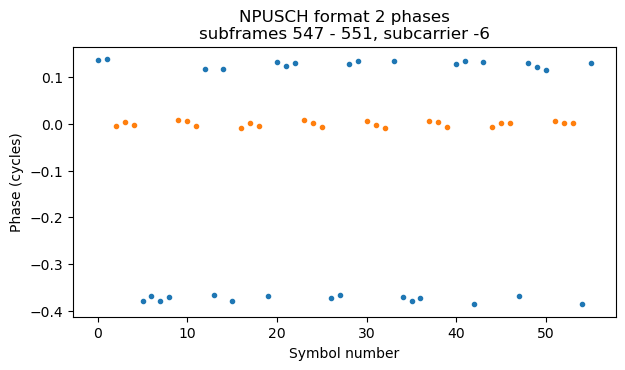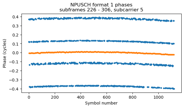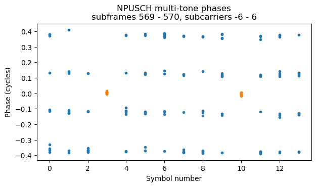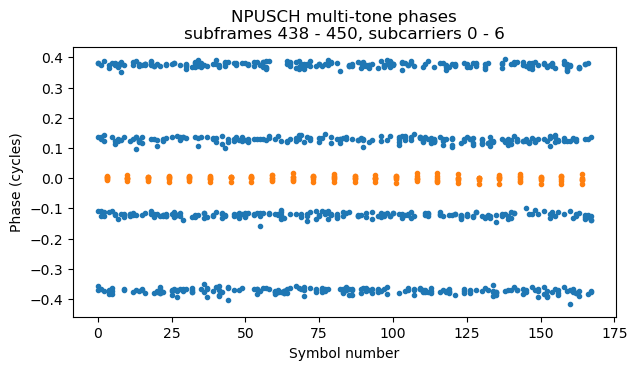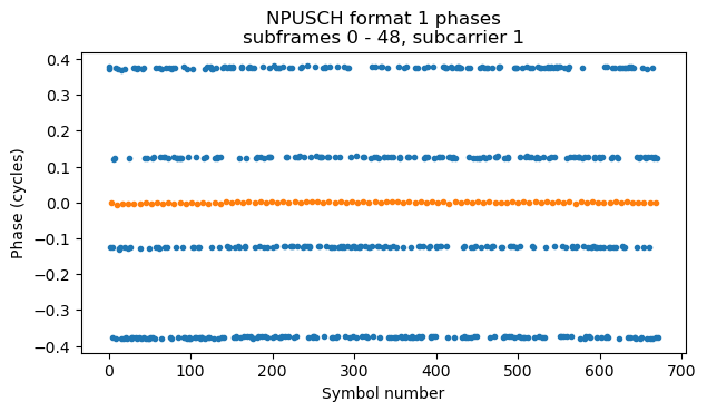 The last NPUSCH transmission is a multi-tone NPUSCH format 1 transmission that uses all the 12 subcarriers and has only one subframe of duration, which corresponds to one resource unit. With 12 subcarriers in use, getting the symbol timing offset right is more critical. Even changing it by one sample (at 1.92 Msps) will give noticeably worse results, although I haven’t needed to implement a fractional delay at OFDM equalization to perform sub-sample timing offset. The constellation and phases for this transmission are shown here.