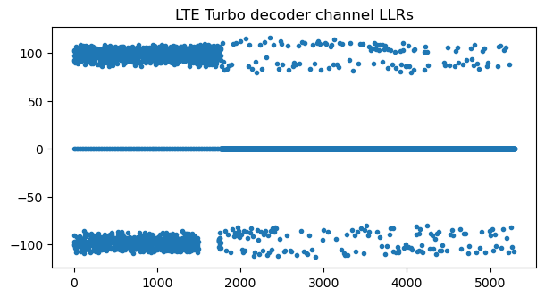 The following plot shows the LLRs after inverting the rate matching algorithm. Since the coding rate is high, many bits in the Turbo codeword have been punctured by rate matching, specially in the last two thirds of the codeword.