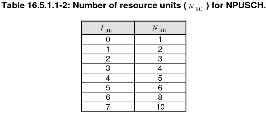 The number of resource units \(N_{\mathrm{RU}}\) that can be used for an NPUSCH transmission, and the corresponding index \(I_{\mathrm{RU}}\) is given in this table in TS 36.213.
