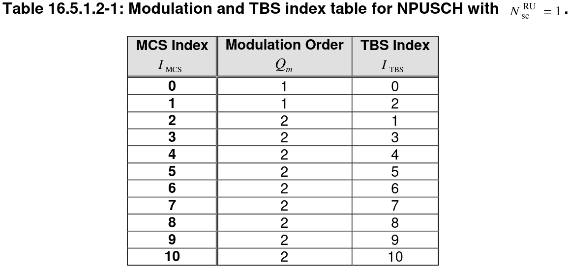 For single-tone NPUSCH, the MCS that are supported are given by the following table. The modulation order \(Q_m\) indicates \(\pi/2\)-BPSK for \(Q_m = 1\) and \(\pi/4\)-QPSK for \(Q_m = 2\). The MCS index is transmitted in the scheduling grant, and this also determines the \(I_{\mathrm{TBS}}\) index.