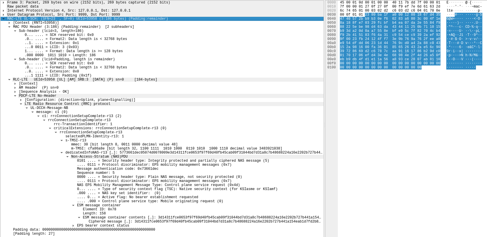 The decoded MAC PDU dissected in Wireshark is shown here. This is the second AM fragment of the RRC connection setup complete retransmission. The UE is able to send the next 23 bytes of the message in this fragment.