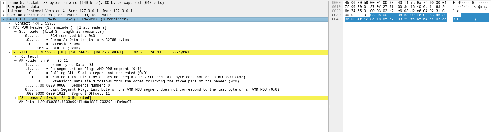 The decoded MAC PDU can be seen here in Wireshark. We see that it contains the first AM fragment of an RLC SDU in SRB 3. Wireshark warns us that the sequence number of this AM PDU, which is zero, is repeated. The RRC connection setup complete message in the previous transmission also used this AM sequence number. We can even see that the AM data in this PDU is the same as the beginning of the RRC connection setup complete message. Therefore, this PDU is a retransmission of the RRC connection setup complete message.