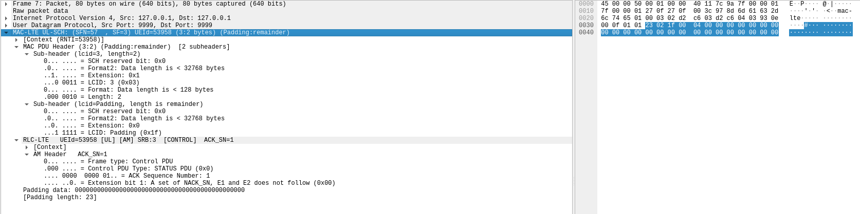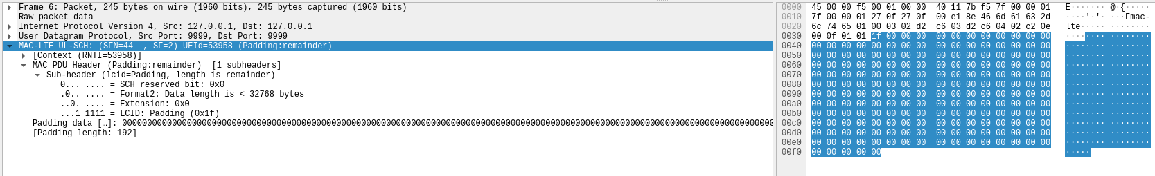 This transmission also uses the highest MCS for QPSK, MCS 13. It is a single repetition of a 6-resource unit transport block, rather than two repetitions of a 3-resource unit transport block. The corresponding transport block size is 1544 bits. Dissecting the MAC PDU in Wireshark we see that it only contains padding. What has happened here? Since the UE had reported in a short BSR that it had data to transmit, it makes sense that it got this relatively large uplink grant to finish transmitting the rest of the data. However, we have seen that the UE has received something on the downlink before this tranmission, because it has sent a positive HARQ acknowledgement. We infer that what the UE has received is the AM ACK for the original RRC connection setup complete message. Therefore, it does not need to retransmit this message anymore, and it does not have anything to be sent in its uplink grant, so it fills it with padding.