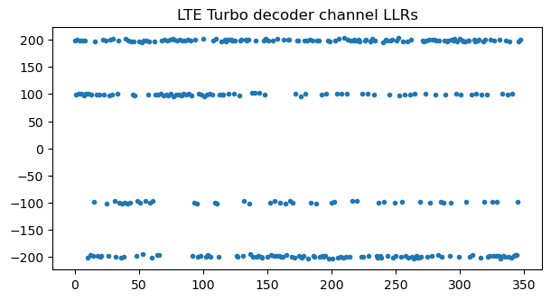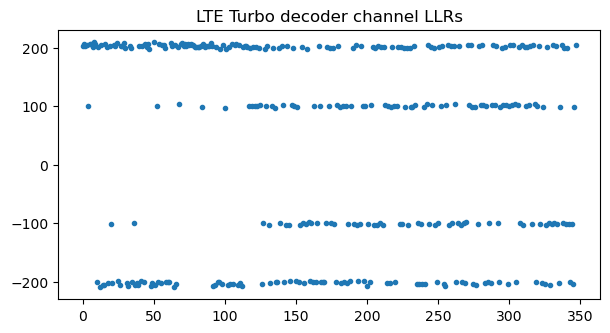 The following plot shows the LLRs after inverting the rate matching algorithm. The LLRs around ±200 correspond to bits that have been transmitted twice.