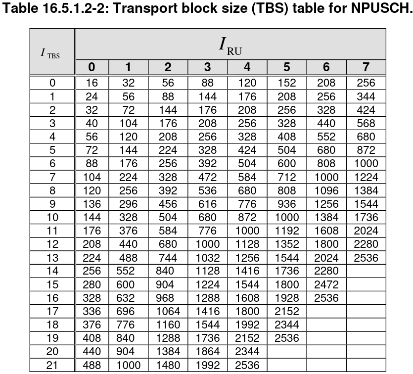 To find the transport block size, we need the following table from TS 36.213. The transport block size is found in terms of two indices: \(I_{\mathrm{RU}}\), which indicates the number of resource units \(N_{\mathrm{RU}}\) used by the NPUSCH transmission, and \(I_{\mathrm{TBS}}\), which is related to the MCS.