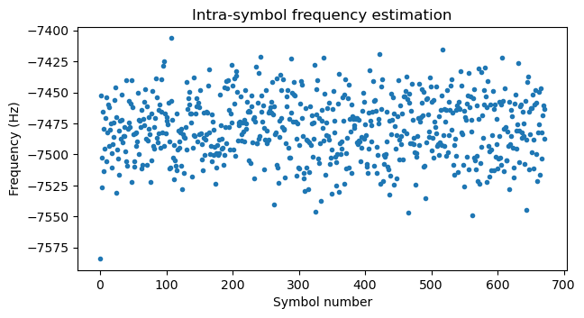 However the intra-symbol frequency estimator gives an average value of 7281 Hz, suggesting that there is a frequency error of 219 Hz, which is reasonably large. This error is caused by a bias in the estimator due to the pulse shape distortion.