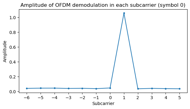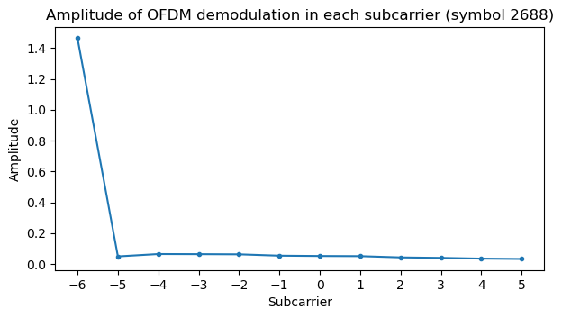 In the amplitude of the subcarriers after OFDM demodulation we can see that the power is concentrated in a single subcarrier, which is a check that the frequency error is small.