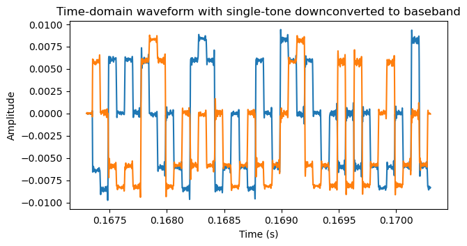 Since the overlay code \(\overline{w}(m)\) contains 3rd roots of unity, from looking at a constellation plot it is quite easy to distinguish single-tone NPUSCH format 1 from NPUSCH format 2. In this recording, the second NPUSCH transmission uses format 2 and subcarrier \(k = -6\). Here is a plot of the time domain waveform after being downconverted to baseband. In this plot I am using a slightly different carrier frequency offset than in the plot for the first NPUSCH transmission. I have found that in this recording each transmission requires a small tweak of a few 10s of Hz to the carrier frequency offset, and sometimes also a few samples to the symbol timing offset.