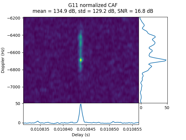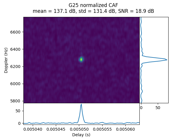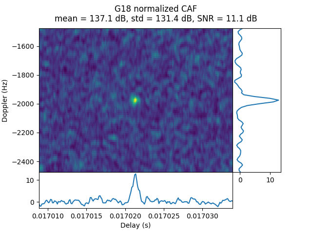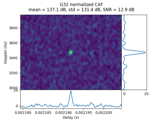 For each PRN, the acquisition algorithm returns an array corresponding to the cross ambiguity function (CAF) of the signal and the replica generated for that PRN. In the Doppler dimension the array has a resolution of \(1/(2kT)\) (by default \(k = 2\)) and it covers the specified Doppler range. In the time dimension the array has a resolution of one sample and it covers the delay range between zero and \(T\).