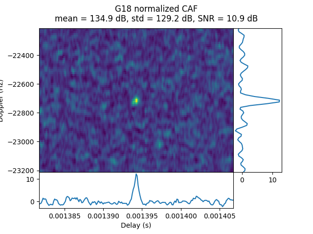 However, when we look at the CAF of these two PRNs, we see that there is a huge spread in Doppler. I investigate this in more detail in a section below.