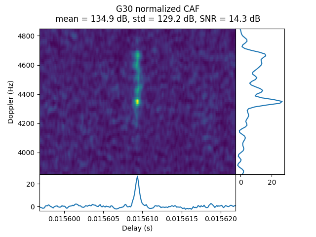 In the CAF of the two stronger signals we can see a Doppler spread effect.