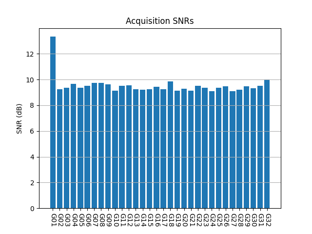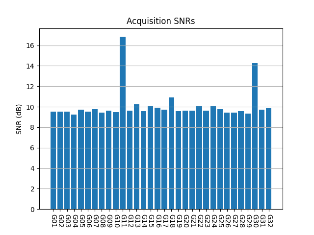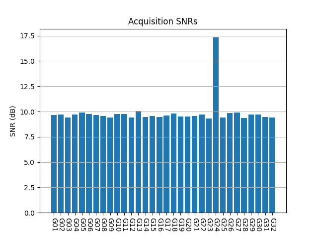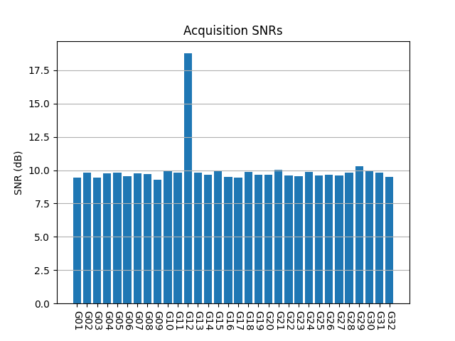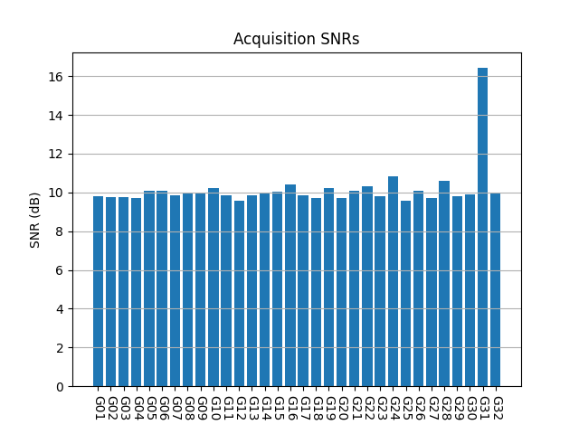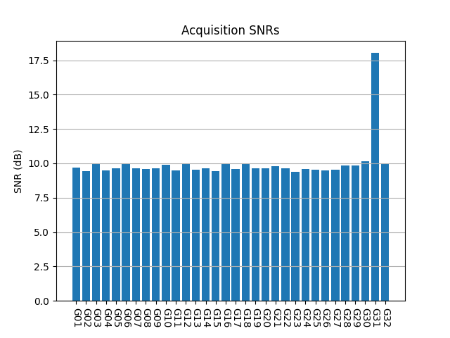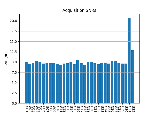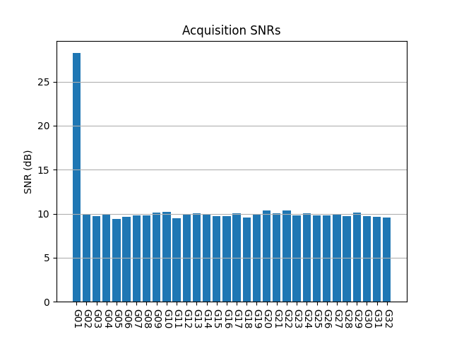 A demonstration of this effect is obtained by performing the same simulation but with a CN0 of 40 dB·Hz for G01. The acquisition SNRs for PRNs that are not present are slightly higher than before.