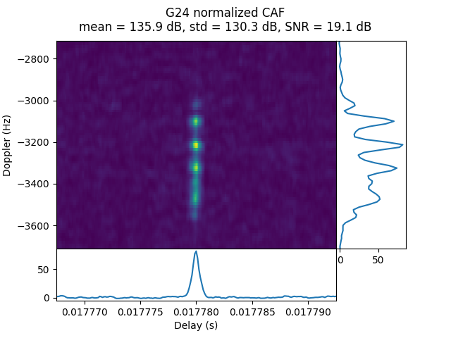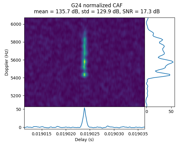 The following plot shows the CAF for a simulated signal with 24 dB·Hz of CN0. The plot has been obtained by running