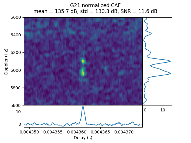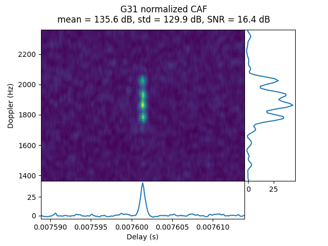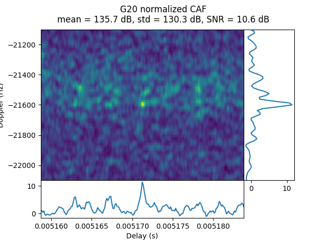 - Rather than finding the maximum CAF peak over a window of 20 ms (twice the coherent integration length), the CAF is restricted to the first 1 ms window