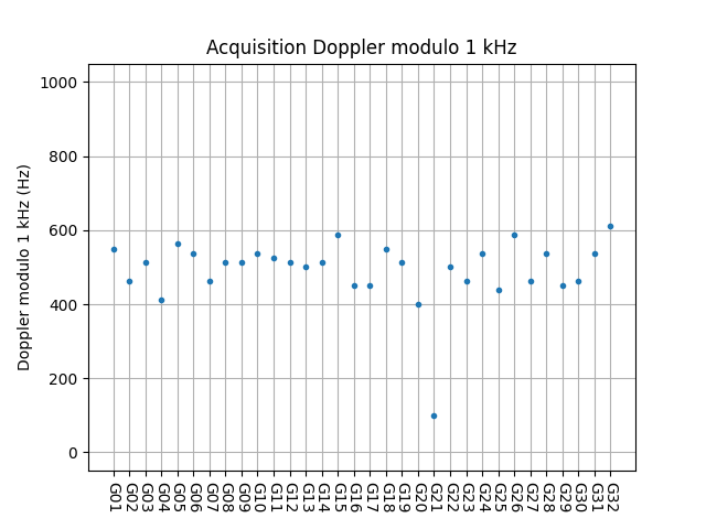 If we plot the acquisition Doppler modulo 1 kHz, we can see that most PRNs have values that are close to 0, which is the Doppler frequency of G01. This means that the correlation peaks found by the acquisition algorithm are actually caused by cross correlation with the G01 signal.