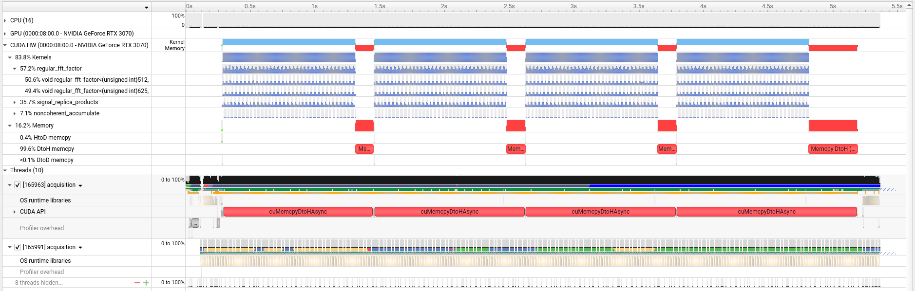 The following figure shows profiling results for the acquisition benchmark example in nsys-ui. We can see the four computes for each PRN followed by the device to host copy of the results. I don’t know why the last device to host copies takes much longer, since all the copies have the same size. I have seen varying levels of throughput for these copies in multiple runs of the same benchmark.