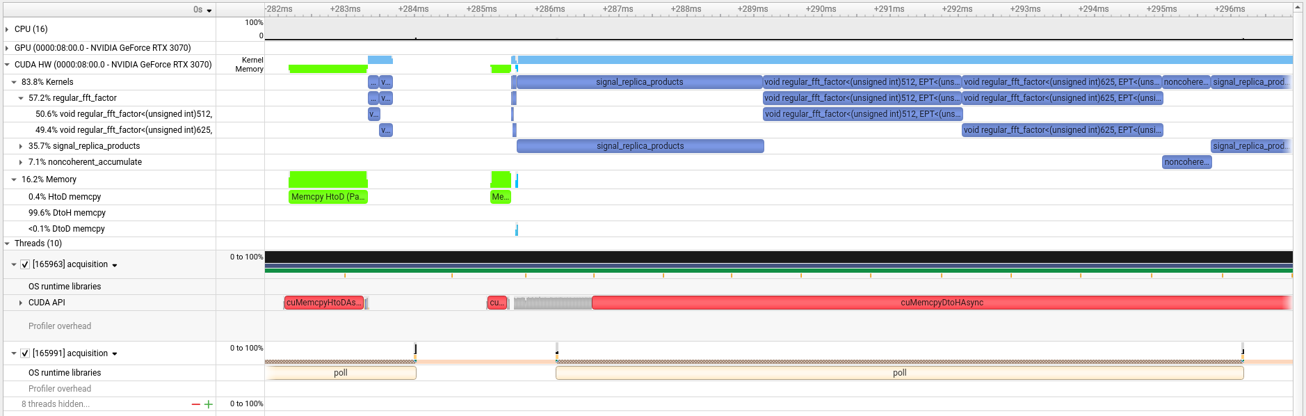 The following figure shows profiling results for the acquisition benchmark example in nsys-ui. We can see the four computes for each PRN followed by the device to host copy of the results. I don’t know why the last device to host copies takes much longer, since all the copies have the same size. I have seen varying levels of throughput for these copies in multiple runs of the same benchmark.