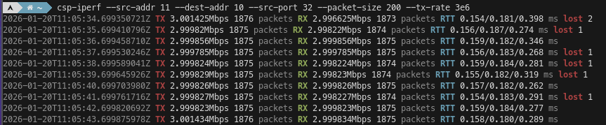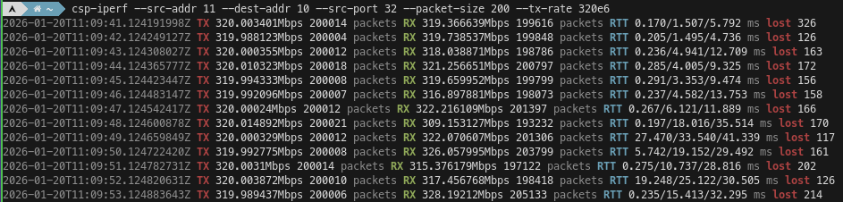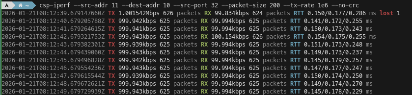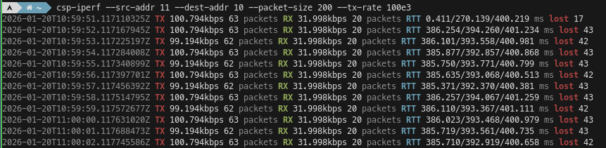 To work around this, we can tell csp-iperf to use a fixed source port, such as 32. With these settings I can reach a rate of a few Mbps on my machine, but packets are occasionally lost.