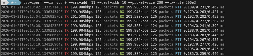 Here we show a 200 kbps csp-iperf test over the vcan interface. This is close to the maximum symmetric data rate that we can get on a 1 Mbps CAN interface.