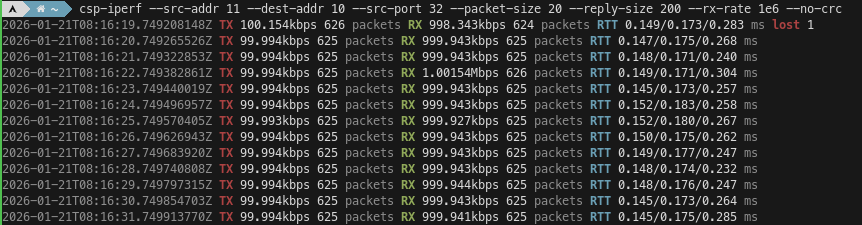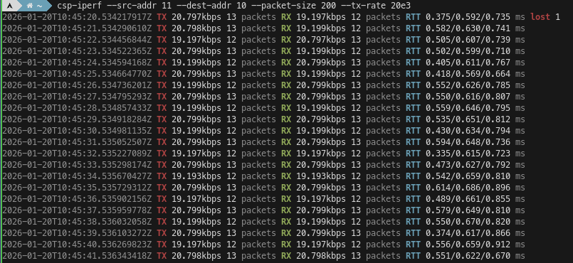 This tells csp-iperf to use a source CSP address of 11, a destination CSP address of 10, a packet size of 200 bytes, and to throttle its transmission to 20 kbps. csp-iperf has a colour output that is easy to read at a glance.