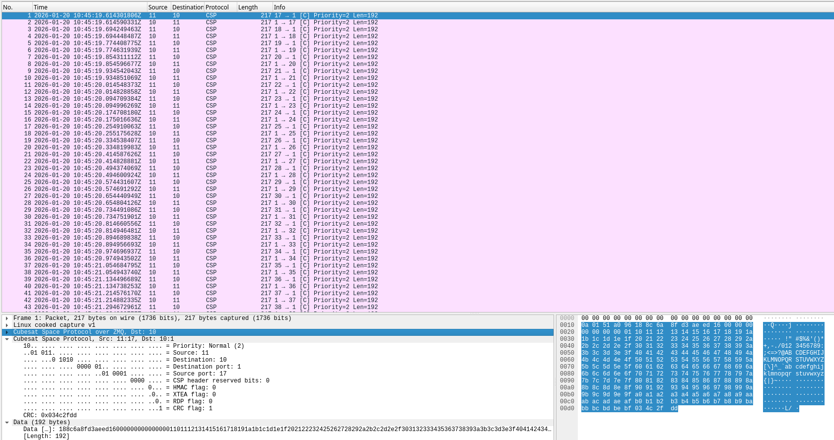 In Wireshark we can see that by default csp-iperf sends CSP packets with CRC to the ping service CSP port 1. The csp_server_client example bounces these packets back to csp-iperf. The source port number used to send the ping packets is chosen from the range 16-63, and it increments with each packet. All this can be customized with command line arguments. We can also see that the payload of the ping packets contains a timestamp (used for RTT measurement), a sequence number (used to count lost packets), and dummy data.