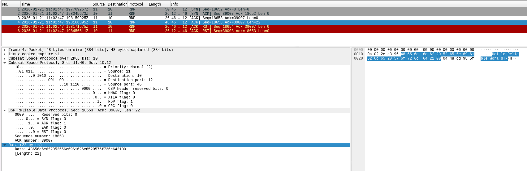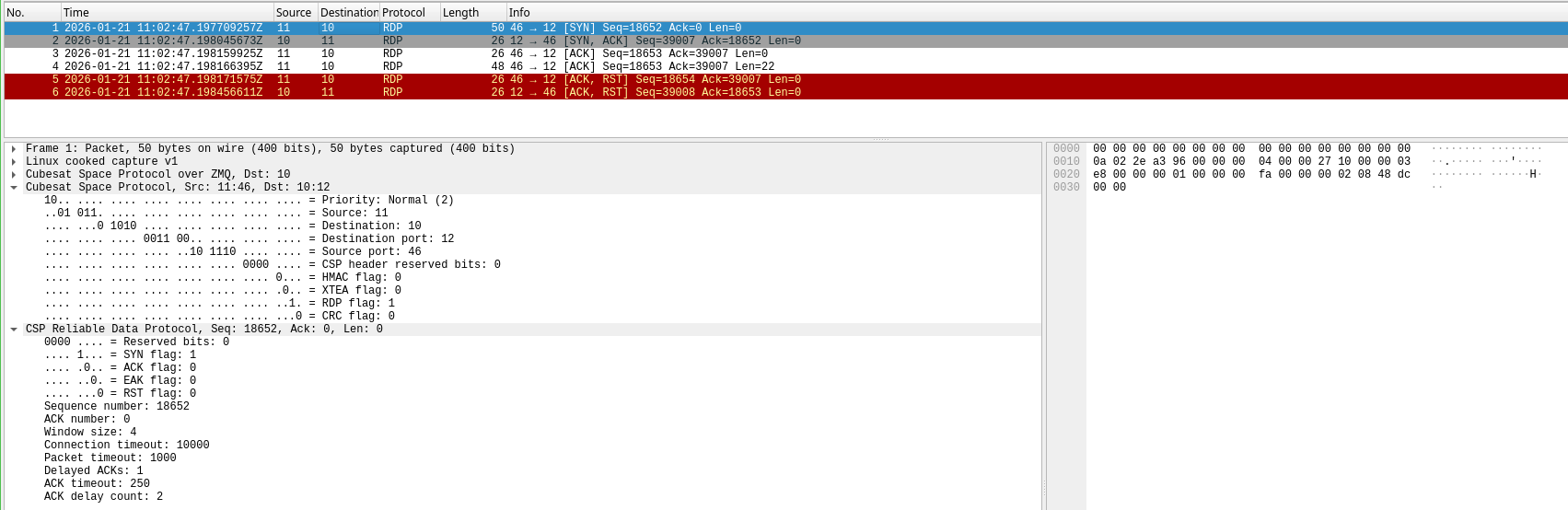 RDP is the Reliable Datagram Protocol defined in RFC 908. CSP uses a variant of this protocol to transmit data reliably in a sequence-controlled way. The Wireshark dissector can parse CSP RDP packets. Here I show an example produced by two test applications that use libcsp to send and receive a short message using RDP.
