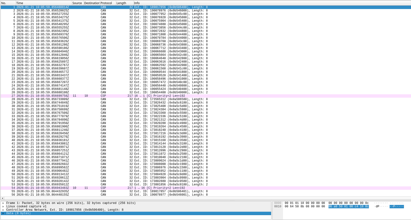 In Wireshark we can see the CAN frames that contain CFP fragments, and the defragmented CSP packet afterwards. It is possible to read some fields directly from the CAN ID in hex. For instance, the first byte (0x0b) is the source CSP address. The second to last byte counts down the number of remaining fragments (0x64, 0x60, 0x5c, …, 0x04, 0x00), but it counts in units of 4 because the next field is 10 bits long.